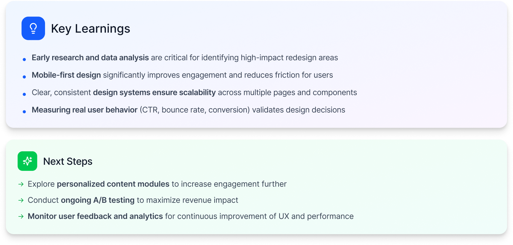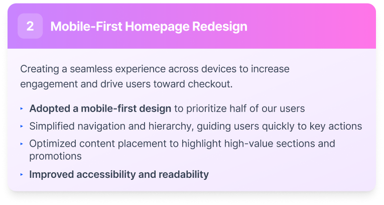 This project reinforced the importance of designing with mobile behaviors at the core of the experience. It also highlighted the value of clear hypotheses, strong documentation, and alignment across product, engineering, and content teams—especially during complex migrations. Most importantly, it demonstrated how thoughtful design in early user journeys can create substantial and measurable business impact.