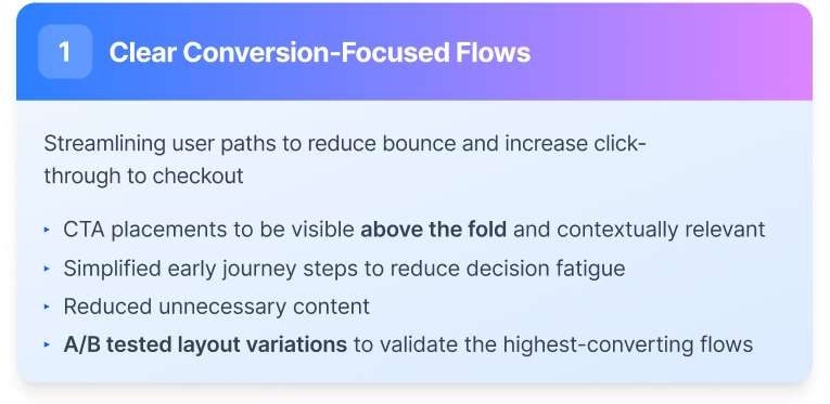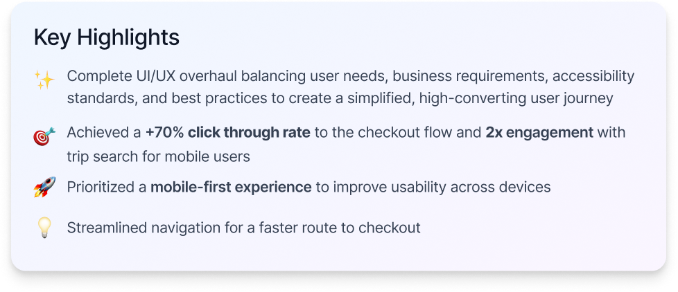 One of the most impactful improvements was the new homepage, which boosted click-through rates to checkout by 70% and doubled mobile trip-search engagement—significantly enhancing the user experience and contributing directly to overall revenue growth.